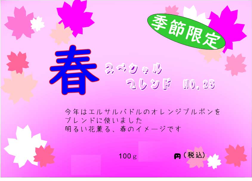 明るい花薫る春をイメージしたブレンドです。コロンビアの柔らかい苦み、ニューギニアの穏やかな香りをお楽しみください。 100g 799円(税込)